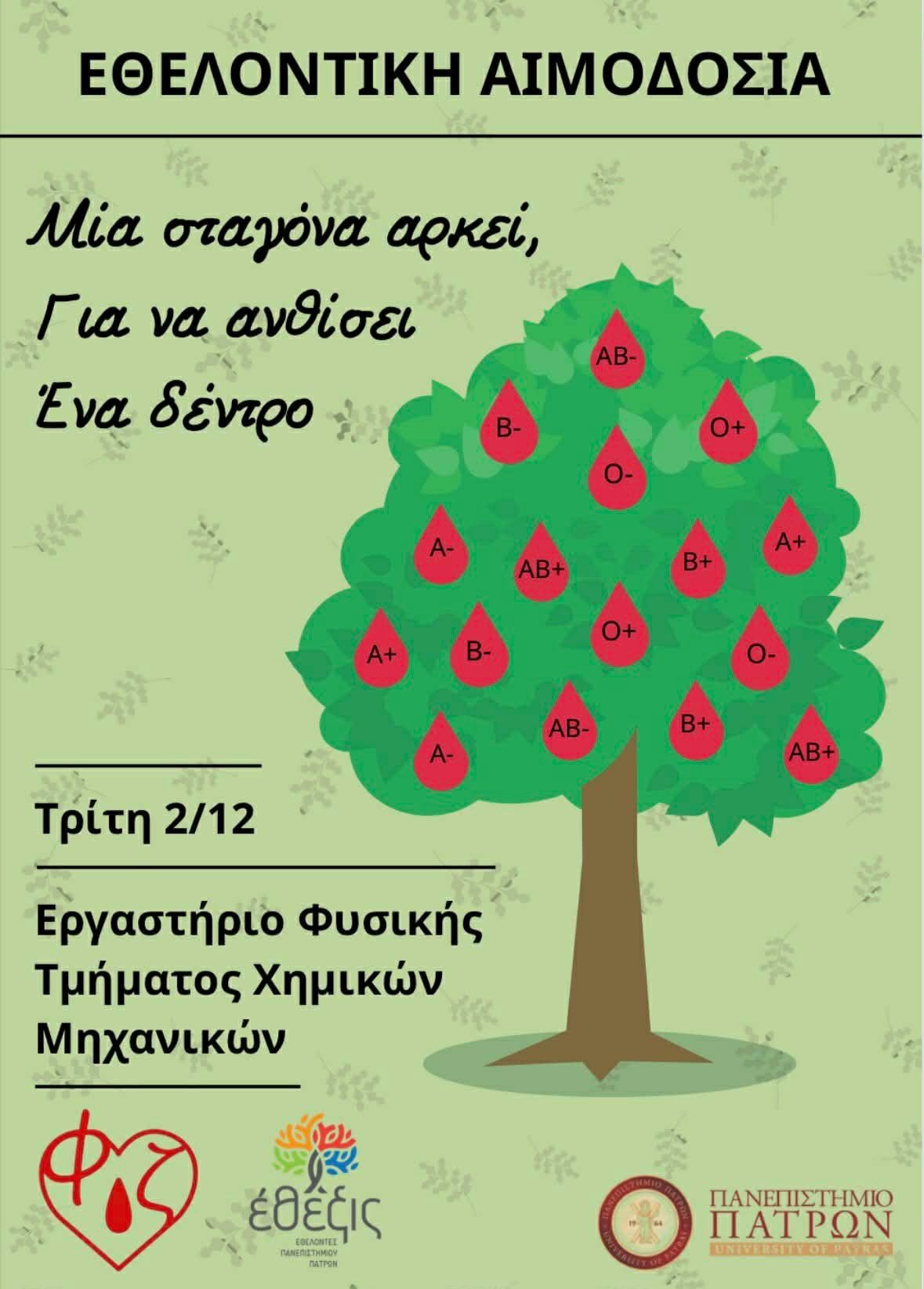 Την Τρίτη 02 Δεκεμβρίου, 10:00 με 13:00, θα πραγματοποιηθεί μία ακόμη αιμοδοσία της Φλέβας Ζωής σε συνεργασία με το Έθεξις, στο εργαστήριο Φυσικής του τμήματος Χημικών Μηχανικών του Πανεπιστημίου Πατρών.